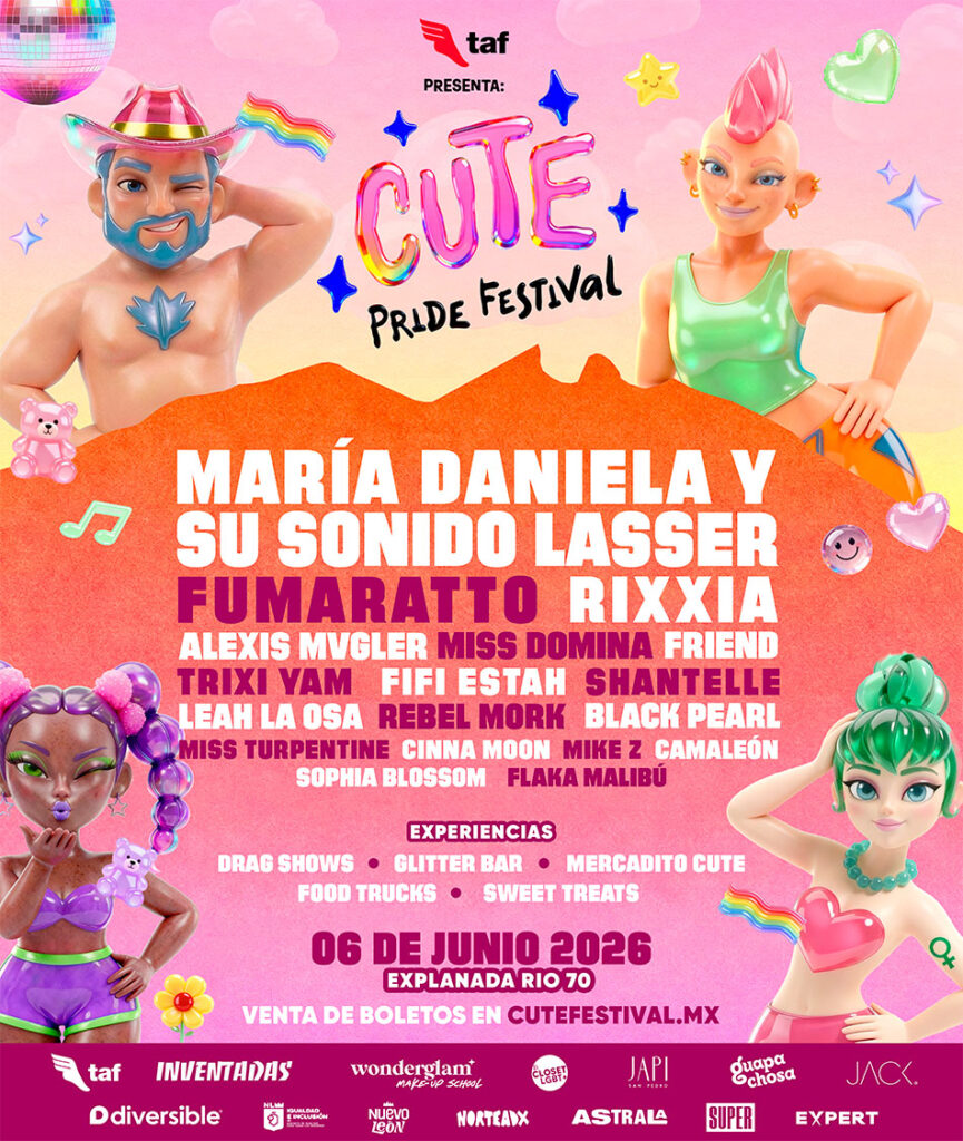 Entre las atracciones principales encontrarás: Escenario, Shows en Vivo, Drag Shows, Glitter Bar, Mercadito Cute, Food Trucks, Sweet Treats.